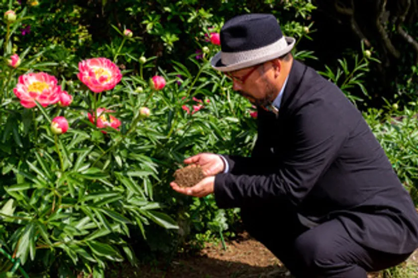 一般的に連作障害のリスクが高く、管理には苦労している施設も多いとされている牡丹。つくば牡丹園では、土壌中の微生物叢(びせいぶつそう)を豊かに良好にすることが、健康な土と健康な花を育むのに重要だということを35年にわたる研究を通じて実践してきました。近年では、茨城県美浦村にあるJRAのトレーニングセンター周辺の馬牧場と連携し、馬ふんベースの発酵堆肥「サラブレッドみほ」を開発しました。