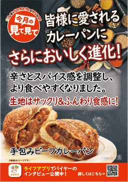 大好評をいただいている「手包みビーフカレーパン」のおいしさはそのままに、お子様から大人までたくさんのお客様にお召し上がりいただける商品にしたいと考え、リニューアルいたしました。