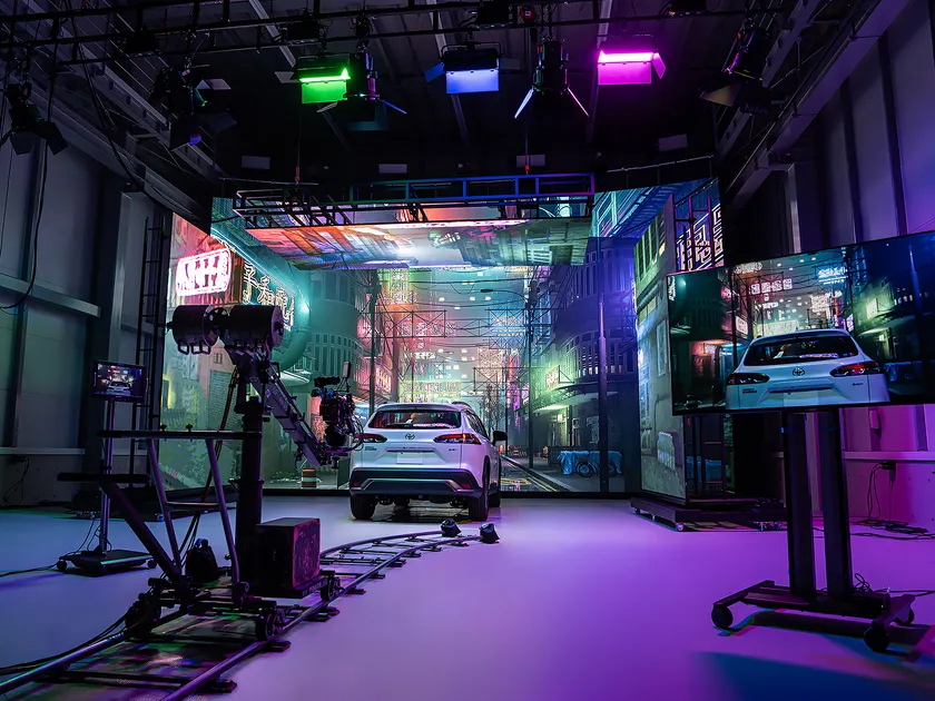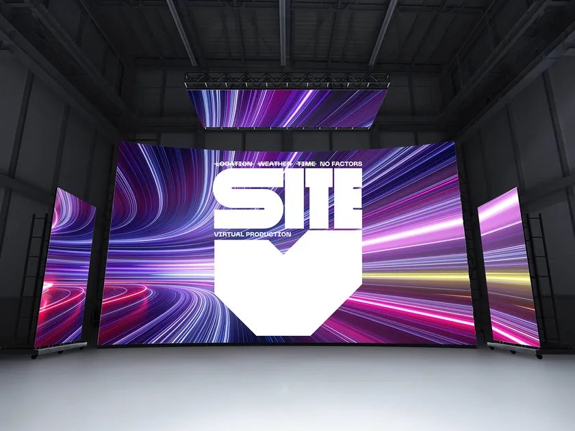 「SITE V」の最大の特長は、第1スタジオに[バーチャルプロダクション(VP)]の設備を完備していることです。これは巨大なLEDスクリーン(幅10.5×高さ6mのメインスクリーンのほかサイドと天井にも装備)に映し出した映像を背景として被写体を撮影する最新の撮影法です。カメラの動きと背景の映像を連動させることで(インカメラVFX)、実際の撮影では不可能な複雑なカメラワークを可能にします。また、俳優や撮影スタッフが足を運ぶことなく、ロケ地で撮影しているかのようなリアルな映像が撮影できるとあって、いまやハリウッド映画ではなくてはならない撮影法となっています。近年、韓国ドラマや国内のCM等でも使われ始めており、クリエイティブの業界でおおいに注目されています。