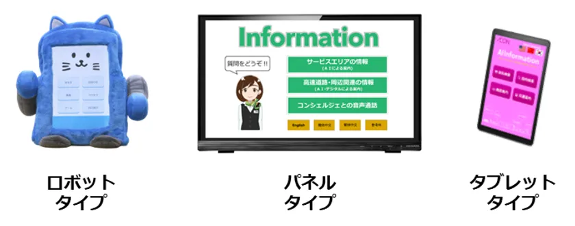 かわいらしいロボットタイプ、ビジネスシーンに適したパネルタイプ、使い勝手のいいタブレットタイプを用意しています。各種利用シーンに合わせ、お選びいただくことができます。