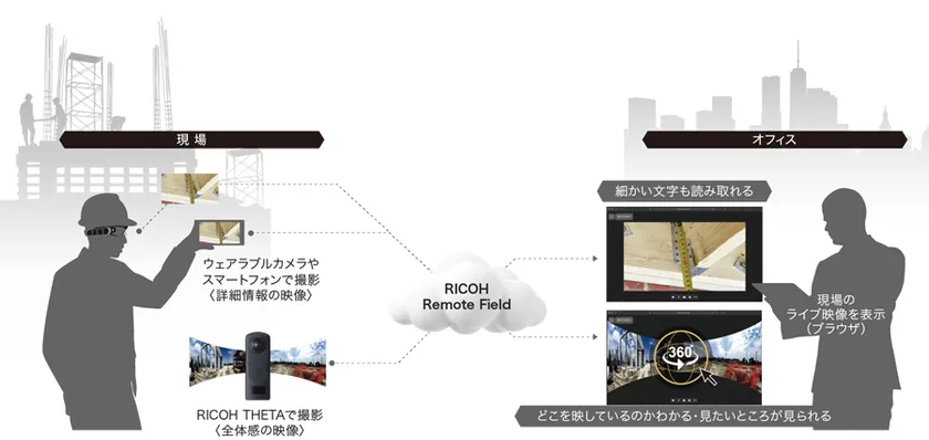・「RICOH THETA」による360度映像とウェアラブルカメラによる詳細映像を並べて表示できるのも「RICOH Remote Field」の特長で、全体観を把握しながら詳細を確認できることで、遠隔からでも現場に行った感覚により近い形で支援が可能です。