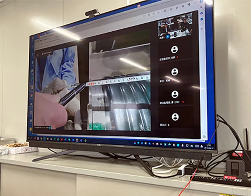 現場に設置した「RICOH THETA」で検査の全体観を配信している様子