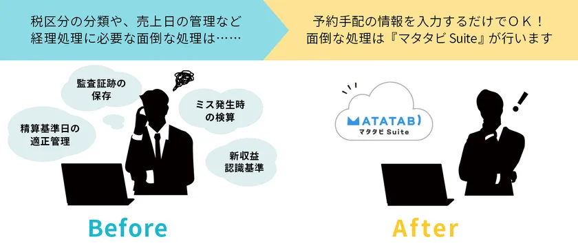 『マタタビ Suite』は、こうした手間を解消するために旅行業務のデータ構造を最適化した新たなモデルを開発。予約手配の情報を入力するだけで、経理処理に必要な多くの業務判断や複雑な計算と検算を自動で素早く処理できるようにしました。これにより、旅行会社で多大なコストがかかっていた現場の業務効率が大幅に上昇。さらに自動化によって業務上のミスが減少しデータが正確になるため、管理業務にかかるコストが削減されます。