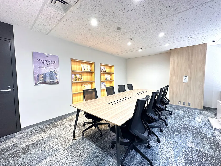 会議室は、木目をアクセントとした壁紙で温かみのある空間を演出。棚には、実際に広島で建築したアパートと部屋の写真を装飾しました。