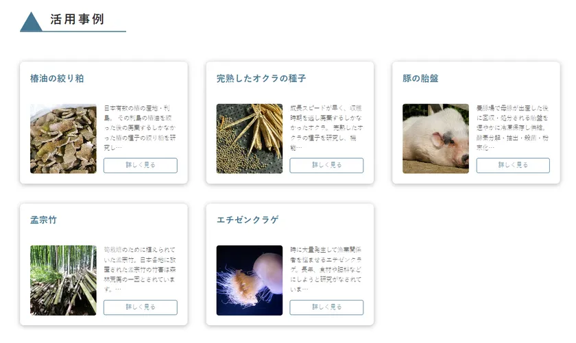 農林畜水産物の規格外品や加工残さなどの未利用資源を抱える側と、それを有効活用したい側をつなげるビジネスマッチングプラットフォームです。
