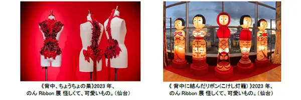 本芸術祭には、のんがこれまで手掛けてきたリボンアートを出展します。大量のリボンを使った、不気味と可愛さがぶつかり合う作風が特徴です。昨年10月に仙台PARCOで発表された、東北の伝統工芸「こけし灯篭」「赤ベコ」にリボンを纏わせた作品も登場します。