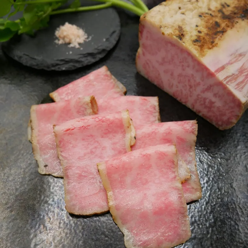 当店の厳選和牛ローストビーフは、全国からA5ランクの黒毛和牛【BMS10~12(A5ランクの中でも最上級)】を仕入、更に肉の旨味を最大限に引き出すスパイスで味付けし、低温でじっくり焼き上げております※1。