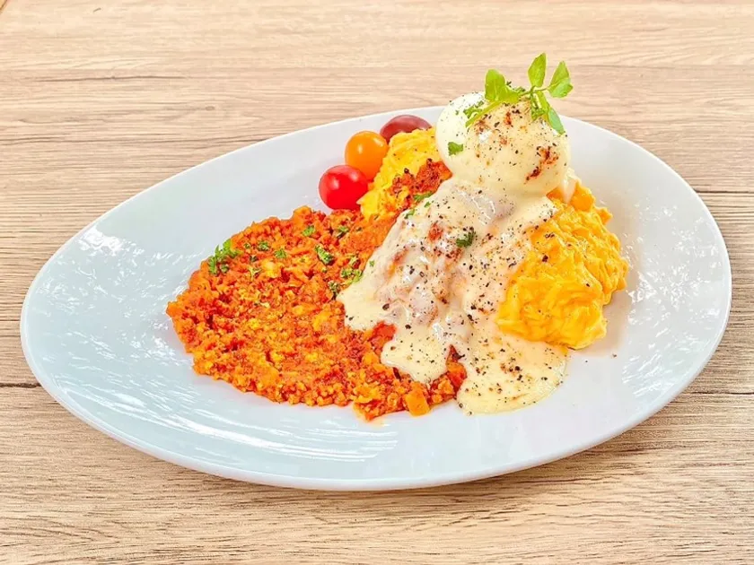 静岡県産いきいき鶏を使用したキーマカレーと日の出たまごを使用したオムライスを掛け合わせたオムカレーです。半熟の日の出たまごとチーズをトッピングし、コクとまろやかさ・スパイスを楽しめるオムカレーです。