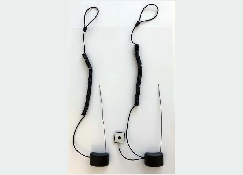 ケーブルタイプで、アパレル衣料、家電製品、工具など、幅広い商品に取付可能。