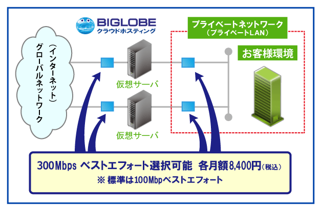 ネットワーク帯域300Mbpsベストエフォートの選択はグローバルネットワーク(インターネット)側、プライベートネットワーク(プライベートLAN)側の両方が選択可能で、各月額8,400円(税込)。