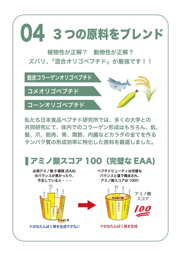 また、アミノ酸スコアも100のため、BCAAやEAAをしっかり補給できることも特徴の一つであり、美肌/美白はもちろん、美ボディも含めたトータルで美を追求することが可能です。