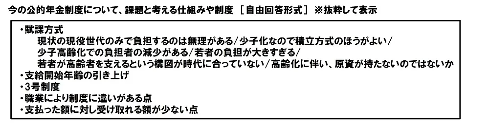 また、今の公的年金制度について、課題と考える仕組みや制度を聞いたところ、「現状の現役世代のみで負担するのは無理がある」「少子化なので積立方式のほうがよい」「少子高齢化での負担者の減少がある」「若者の負担が大きすぎる」「若者が高齢者を支えるという構図が時代に合っていない」「高齢化に伴い、原資が持たないのではないか」といった「賦課方式」に関する回答が多く挙げられました。