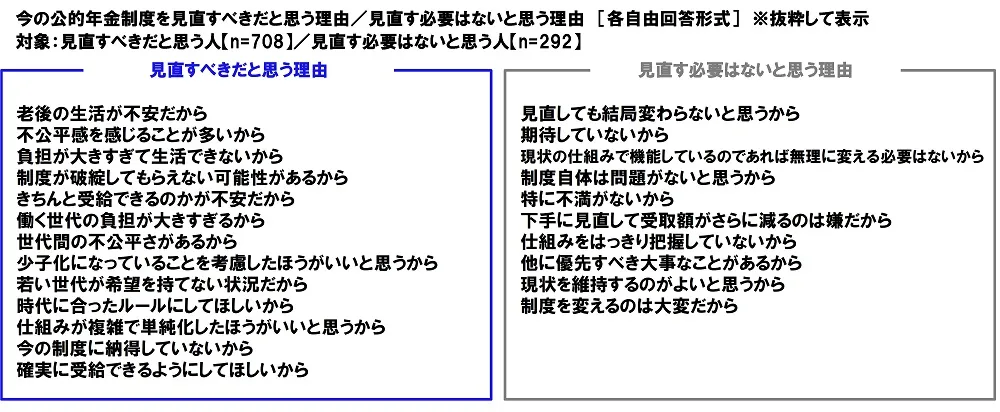また、今の公的年金制度を見直すべきだと思う人(708名)に、制度を見直すべきだと思う理由を聞いたところ、「老後の生活が不安だから」「不公平感を感じることが多いから」「負担が大きすぎて生活できないから」「きちんと受給できるのかが不安だから」「働く世代の負担が大きすぎるから」「少子化になっていることを考慮したほうがいいと思うから」「時代に合ったルールにしてほしいから」「確実に受給できるようにしてほしいから」といった回答が挙げられました。他方、今の公的年金制度を見直す必要はないと思う人(292名)に、制度を見直す必要はないと思う理由を聞いたところ、「見直しても結局変わらないと思うから」「期待していないから」「現状の仕組みで機能しているのであれば無理に変える必要はないから」「特に不満がないから」「仕組みをはっきり把握していないから」「制度を変えるのは大変だから」といった回答が挙げられました。