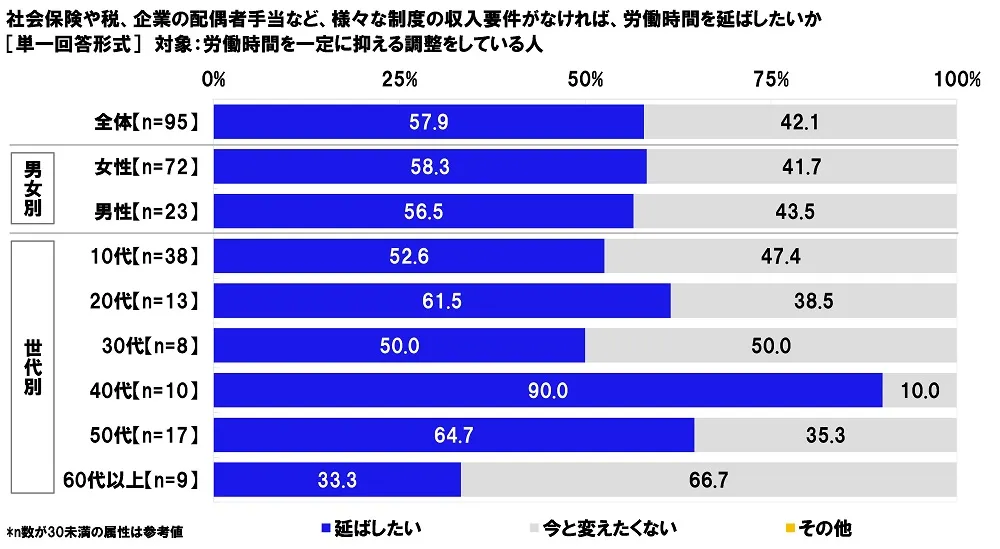 また、労働時間を一定に抑える調整をしている人(95名)に、社会保険や税、企業の配偶者手当など、様々な制度の収入要件がなければ、労働時間を延ばしたいか聞いたところ、「延ばしたい」は57.9%、「今と変えたくない」は42.1%となりました。