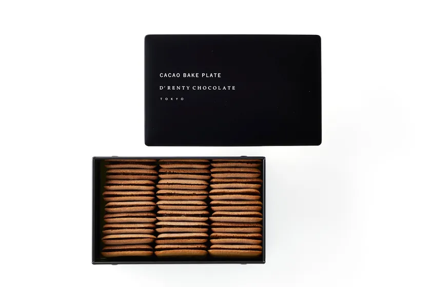 D'RENTY CHOCOLATEの新商品『カカオベイクプレート』は、ブランド初となるクッキー缶のためにお作りしたラングドシャサンド。看板商品『カカオベイクサンド』でも存在感を放つチョコレート入りラングドシャのサクサク食感と、チョコレートの華やかな香りと甘みを活かしたガナッシュは相性抜群。「1枚、2枚、3枚…あともう1枚!」と心行くまでお楽しみいただきたくて、缶に隙間なくぎっしり詰め込みました。モノトーンのシックな缶の使い道を考えるのも楽しいひと品です。