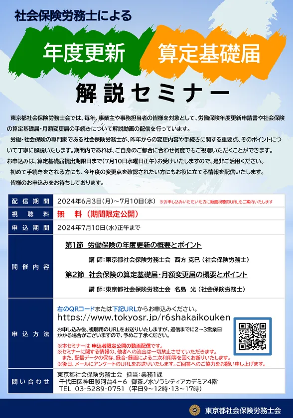 社会保険労務士による年度更新・算定基礎届 解説セミナー 6月3日~7月10日の期間限定で動画配信