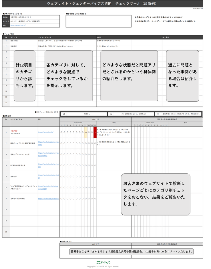 合同会社あやとり(本社:静岡県浜松市、CEO:生田明子)は、日本国内でウェブサイトの運営をしている企業向けに、ジェンダー表現に偏りがないかをオンライン上でチェックする「ウェブサイトジェンダーバイアス診断」サービスを提供しております。