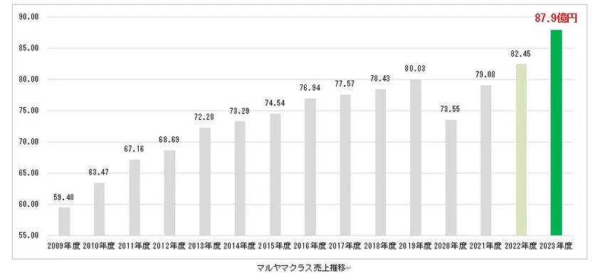 マルヤマクラスは2009年に開業、開業初年度の年商59.5億円以降、10年連続で増収し2019年度には80億円を突破。新型コロナウイルス禍を経て2022年度には2019年度の最高売上を更新し、2023年度も前年比106.6%と大きく記録を更新、2024年3月度時点では単月ごとの過去最高売上を16か月連続で記録している。