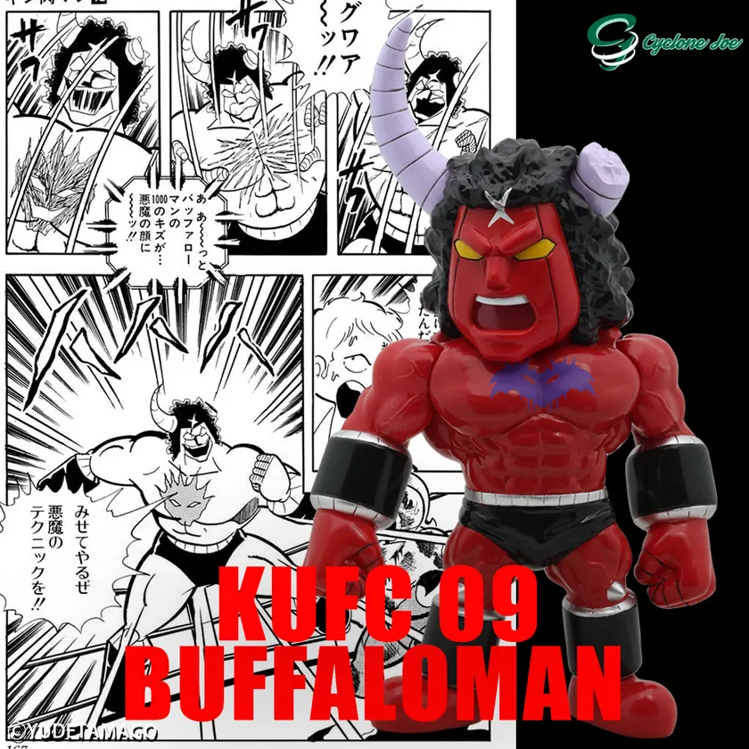 株式会社サイクロンジョー( https://www.cyclonejoe.com/ )は、累計発行部数7,700万部の大人気連載漫画『キン肉マン』をテーマにしたフィギュアシリーズ『KUFC』より、KUFC 09 バッファローマンのソフビフィギュア8種の予約受付を、サイクロンジョー直販にて2024年5月17日(金) 21:00~から開始します。