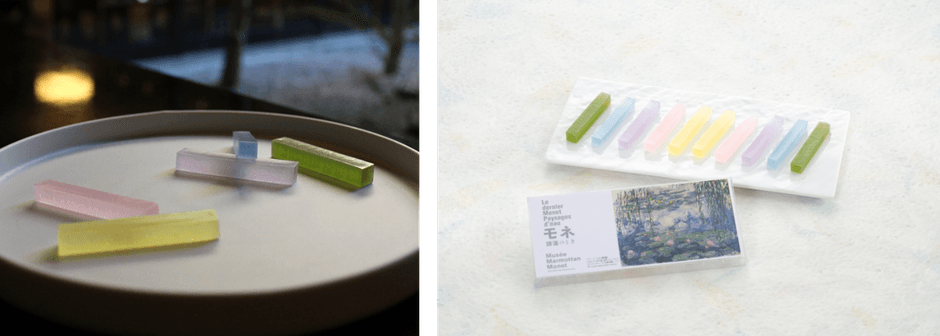 鶴屋吉信が手がけるブランド「IRODORI」人気商品である「琥珀糖」を、本展覧会オリジナルの風味・パッケージデザインにておつくりいたしました。しゃりっ・つるっとした繊細で独特な食感の琥珀糖は、画材のパステルに見立てたスマートなスティック型。ほのかに光を透かす質感にのせた淡く美しい色彩が、本展覧会のメインともなっている代表作「睡蓮」シリーズを想わせるビジュアルです。