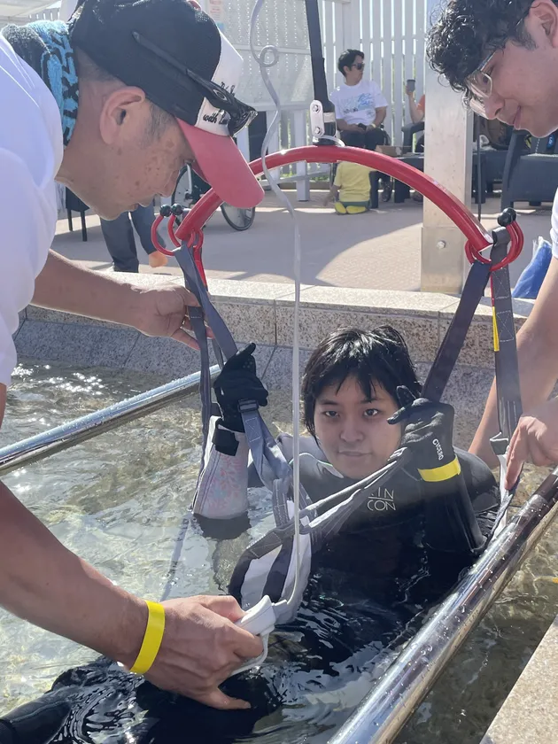 上記大会に先駆け5月11日に開催された「パラサーフィン体験会」においても、介護リフトを持参し、ジャグジーに介護リフトを設置しました。体験会に参加された方は、サーフィンの体験をされた後に当社のリフトでジャグジーに入っていただきました。参加された方は「朝早く家を出てここに来ました。パラサーフィンは初めてです」と言う事で、サーフィン体験後に介護リフトも体験していただき、リフトで吊り上がった際には満足な表情をされていました。他の参加者の方々からもリフトでジャグジーに入れた事で「とても快適です」と満足されていました。