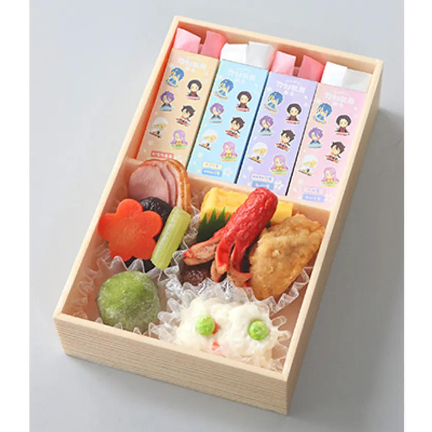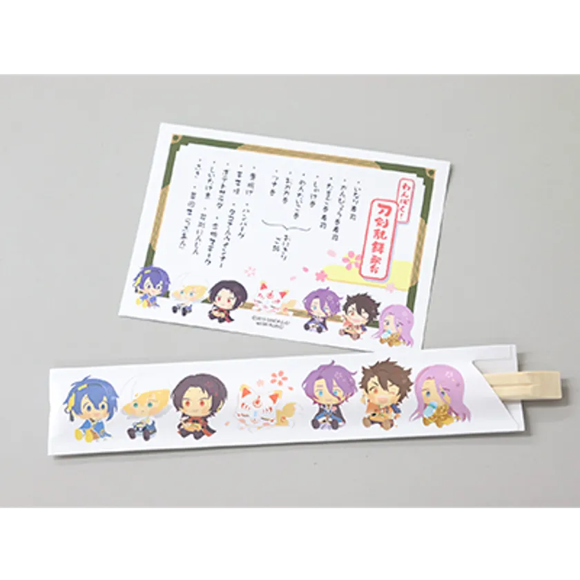 フェア限定の描き下ろしイラストをデザインした、コラボレーション駅弁を発売します。6振りの刀剣男士をイメージした巻寿司とおにぎり巻、こんのすけをイメージしたいなり寿司を、色とりどりのスリーブで包み込みました。本商品限定のノベルティカードが1枚封入されており、絵柄はシークレットを含む全14種類です。どの絵柄が出るか、駅弁とあわせてお楽しみください。