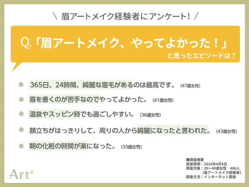 また、「眉アートメイクをやってよかったと感じたエピソード」について募集すると、いつでもきれいな眉をキープできる、メイクの悩みが解消した、垢抜けて褒められた、といった声が多く寄せられました。