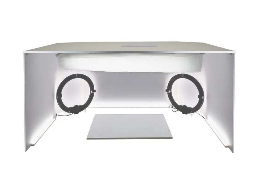 この装置は、自宅やオフィスなど作業場所が違っても室内の光源の向きや明暗などに影響されず、卓上に設置するだけで影や写り込みの問題などをクリアし、今までにないきれいな手元作業の撮影を可能にするものです。
