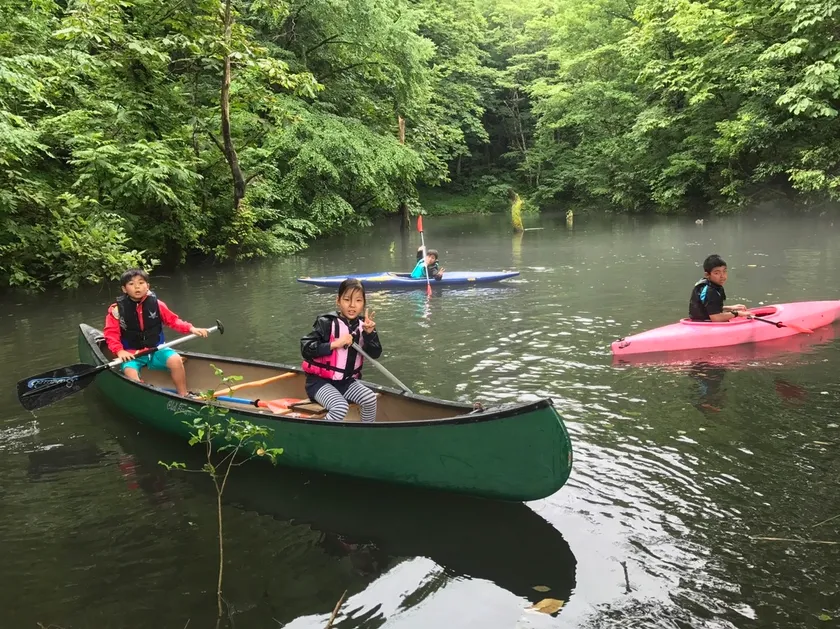 北アルプスから雪解け水が注ぐ幻想的な池で、マイナスイオンを浴びながらカヌー体験にチャレンジします。その他にも魚のつかみ取りをして、子どもたちが自分で捌きます!