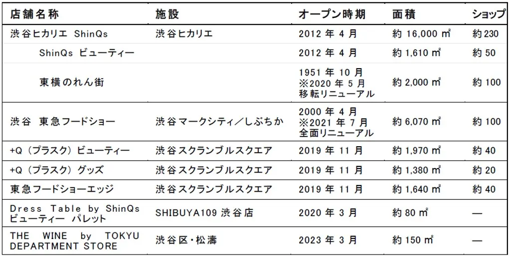 1934年、東急東横線渋谷駅の駅舎と一体の建物に、関東初の私鉄直営のターミナルデパートとして、「東横百貨店」(旧 東横店)をオープン以降、1967年に本店をオープンし、駅周辺の渋谷の賑わいを面として広げました。渋谷の再開発に伴い、2020年に東横店、2023年に本店の営業を終了しましたが、現在は渋谷において、渋谷ヒカリエ ShinQsや渋谷 東急フードショー、渋谷スクランブルスクエア内の+Q (プラスク) ビューティーと+Q (プラスク) グッズ、東急フードショーエッジなどを展開しています。