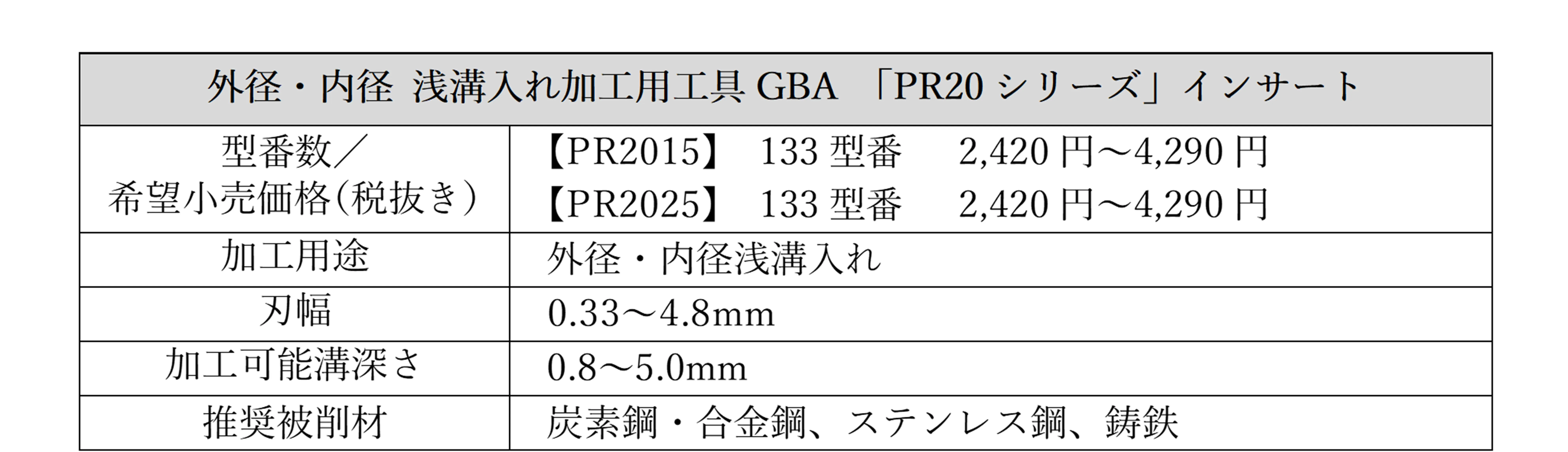 このたび、このGBAに新開発のPVDコーティング材種「PR20シリーズ」を追加しました。PR20シリーズは、溝入れ/突切り加工用に開発した新材種です。切削熱による酸化や摩耗に強い新コーティング「MEGACOAT(R) NANO EX」(メガコート ナノ イーエックス)の特性によって、鋼やステンレス鋼、鋳鉄の高精度・長寿命・安定加工を実現します。PR2015は鋼、鋳鉄加工用の第1推奨材種、PR2025はステンレス鋼加工用の第1推奨材種として、浅溝入れ加工の生産性向上に貢献します。