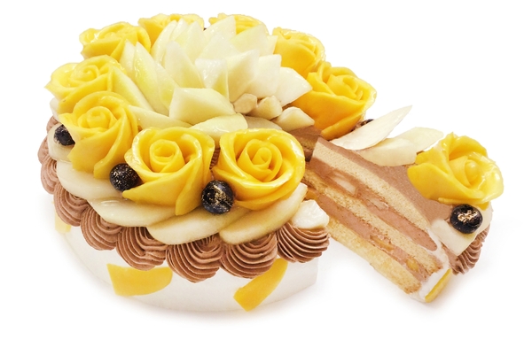 マンゴーで咲かせた美しいバラと、今が旬の洋梨をあわせました。濃厚なチョコレートクリームと、みずみずしい洋梨を中にもたっぷりサンドした、相性抜群の組み合わせです。