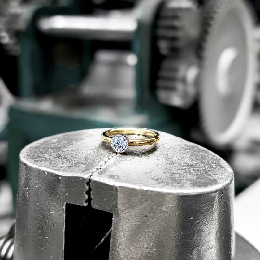 鍛造(たんぞう)とは、金属を直接叩き鍛えながら指輪を作る、伝統的な製造方法のことです。金属を型に流し込んで作る鋳造(ちゅうぞう)と比べ、強度、耐久性、質感、輝きなど、あらゆる品質が高まります。しかし鍛造製法は、職人の高い技術が必要なことと、大量生産に向かないため、行なっているお店は極めて少数です。