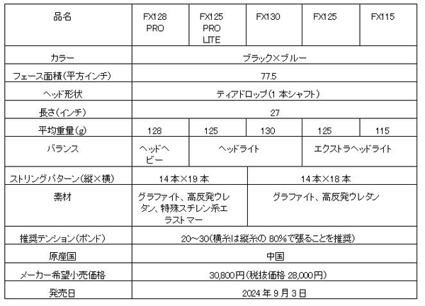 「FX」シリーズは、「BE A FORCE OF POWER(パワーと共に)」をテーマに、テニスラケットで培った技術を搭載することで、パワーアップとコントロール性能の向上、快適な打球感を実現したスカッシュラケットです。3機種追加で、プロ使用モデルから初心者モデルまで幅広いユーザーにご使用いただけるラインアップとなりました。メーカー希望小売価格は、各30,800円(税抜価格28,000円)です。「FX128 PRO」をPSAランキング1位のアリ・ファラグ選手(エジプト)が、「FX125 PRO LITE」を日本ランキング1位の机龍之介(つくえりゅうのすけ)選手(ダイナム)が使用予定です※1。