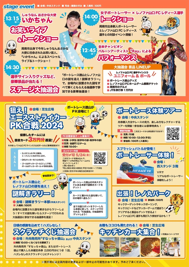 中央スタンドイベントステージでは、周南市出身で今年しゅうなんおさかな大使に任命された「いかちゃん」によるお笑いライブ&トークショーや、バルーンアーティスト全米チャンピオンのRayさんによるパフォーマンスのほか、レノファ山口FC選手サイン入りグッズなどの豪華景品が当たるステージ大抽選会が開催されます!