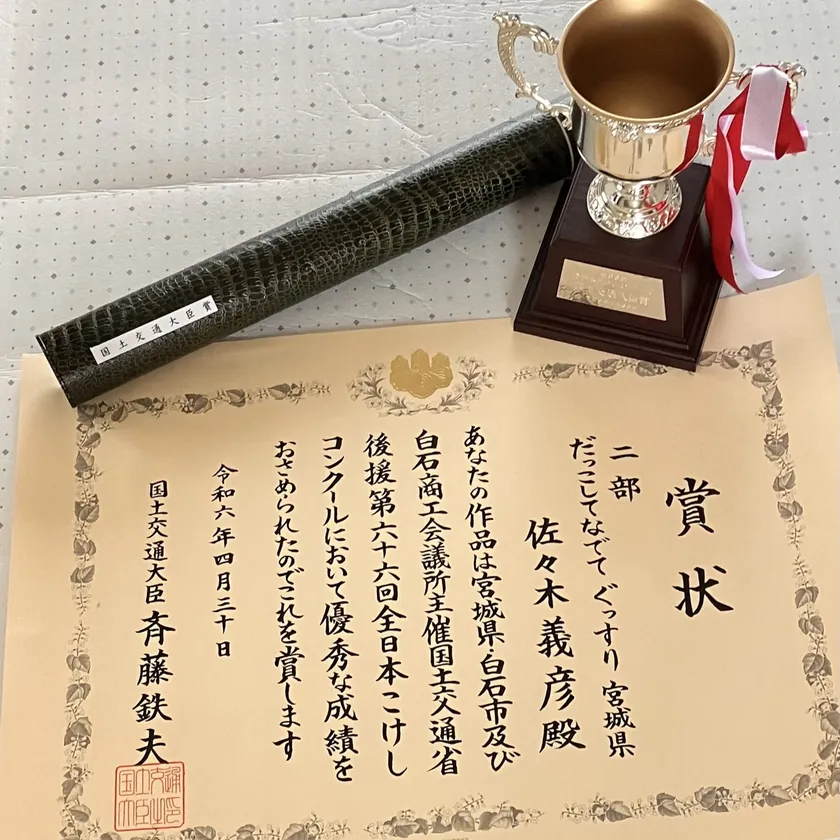 5月3日~5日に開催された第66回全日本こけしコンクールでは延べ160人から709点の出品がありました。内閣総理大臣賞に次ぐ大臣賞8作品のひとつです。ゆこけし研究所の代表者で作者の佐々木 義彦は65歳にして絵付けを始め、わずか2年あまりでの受賞となりました。