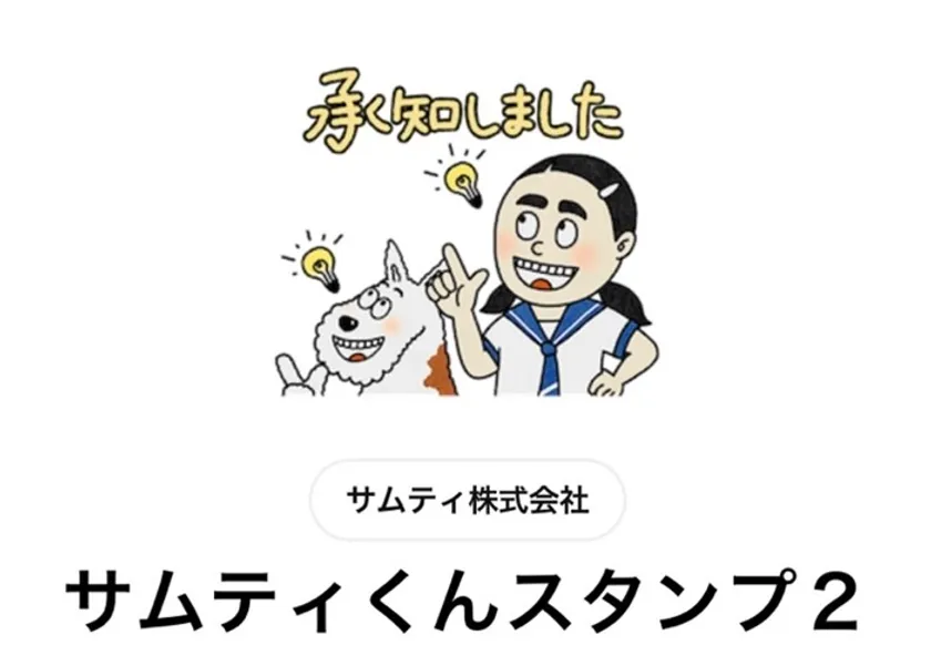 サムティくんCMの「あのシーン」が、LINEスタンプで楽しめます!CMに登場するサムティくんとイモトさんの表情豊かなスタンプです。「承知しました」「ありがとうございます」など、ビジネスシーンでも使いやすいコトバを厳選。可愛らしいキャラクターとあたたかみのある手描きフォントで、楽しくお使いいただけます。LINEスタンプの検索画面にて「サムティくん」で検索してください。