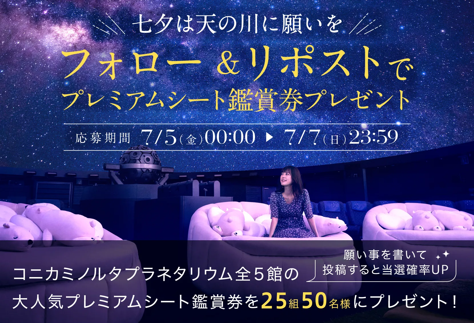 コニカミノルタプラネタリウム直営館の全5アカウントで、フォロー&リポストを行ってくださった方の中から抽選で25組50名様に、大人気のプレミアムシート鑑賞券が当たるX(旧Twitter)キャンペーンを実施いたします。願い事を書いて引用RPで投稿すれば当選確率UP!