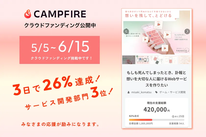 「人の想いを届ける」をミッションに掲げる株式会社tayori(所在地:東京都中野区、代表:小松 実咲)は、自分が死んでしまった時に大切な人に向けて訃報と最後の便りを自動で送信できるサービス「tayorie(たよりえ)」の開発資金を、クラウドファンディングサイト「CAMPFIRE」にて、2024年6月15日(土)まで募ります。