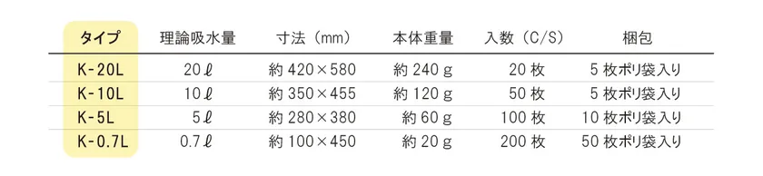 ・吸水量0.7L、5L、10L、20Lの4タイプを取り揃え。用途に応じてお選びいただけます。