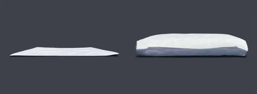 ・不織布外袋の中にシート状の吸水ポリマーが入っており急速に水を吸収します。