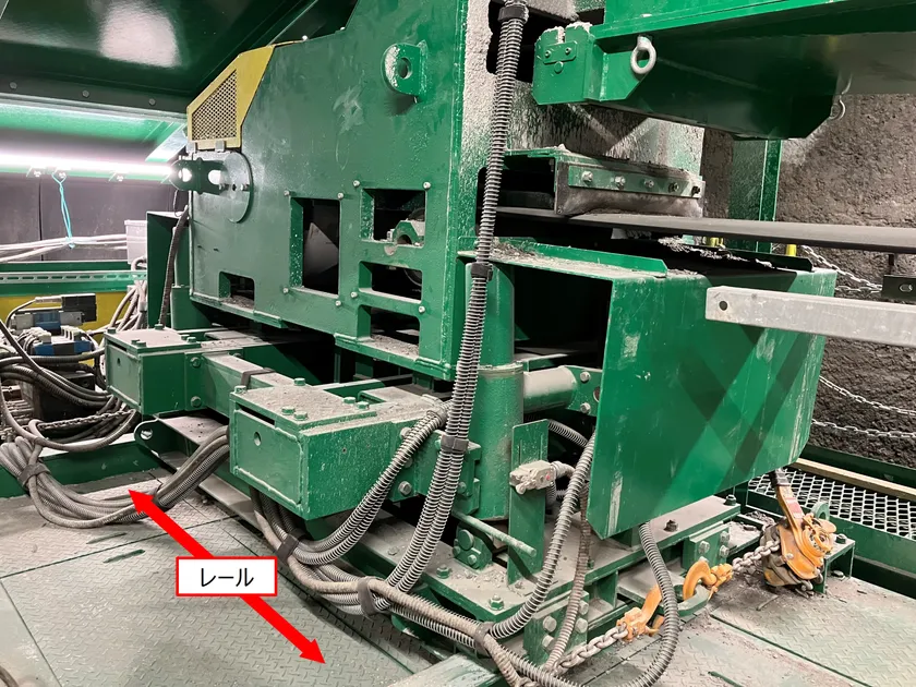 テールピース台車に設置されたベルト緊張部(写真2)を底部のレールにより左右にスライド可能とし、急曲線部におけるベルトの曲がりを緩和し、蛇行を抑制する。緊張部のスライドに合わせて破砕機の投入部のホッパーも稼働する。