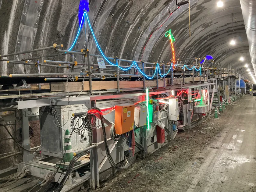 連続ベルトコンベヤ工法は、移動式破砕機と連続ベルトコンベヤからなる、山岳トンネルにおけるズリ出し手法の一つです。坑内切羽付近に設置した破砕機に、トンネル掘削により発生したズリ(岩塊)を投入することにより、ベルトコンベヤで運搬しやすいサイズの砕石に破砕を行い、コンベヤにより坑外まで搬出します。