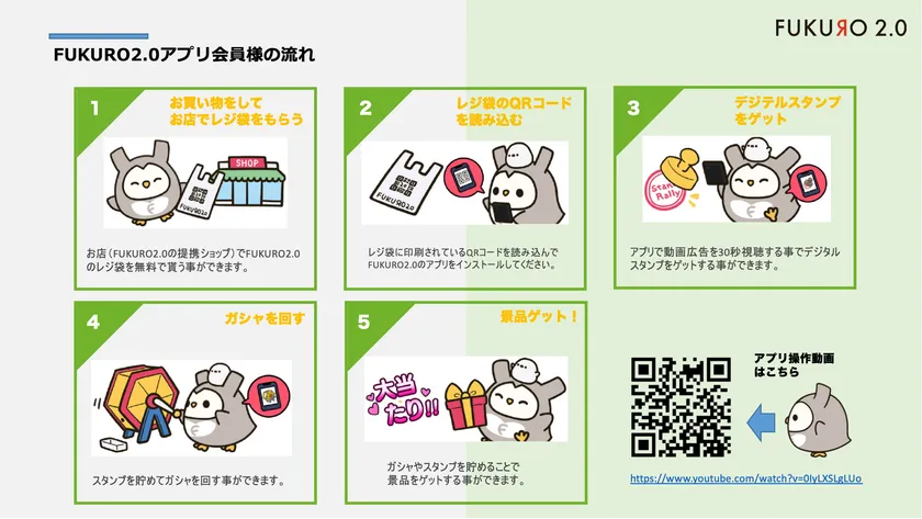 さらに、お客様の継続利用を促進するために、レジ袋に印字されたQRコードを読み込むことでスタンプを獲得し、景品交換が可能なFUKURO2.0アプリも提供します。レジ袋でを貰うだけではなく、特典も獲得できる仕組みです。