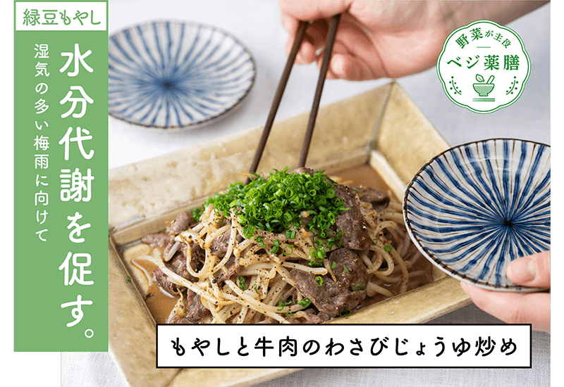 もやし(緑豆もやし)には、体の余分な水分を代謝してくれる働きがあります。これから来る梅雨は、不調をもたらす湿気によって、体が余分な水分をため込み、むくみやだるさが起こりやすい季節。元気に梅雨を乗り切るためにも「もやしと牛肉のわさびじょうゆ炒め」を食べて、“水はけ”のよい体をつくっていきましょう。