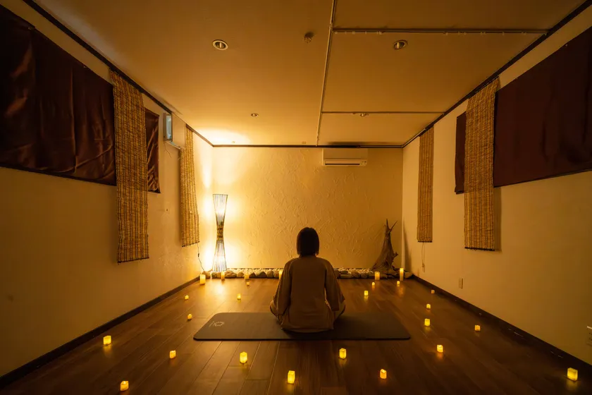 心を落ち着かせポジティブな気持ちに導くヨガ・瞑想療法。「誘 izanai」の部屋で瞑想やヨガ、晴れの日は湖を見ながらヨガを行い体内時計をリセット。