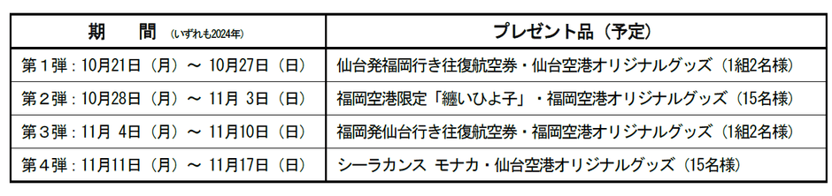 2024年10月21日(月)から11月17日(日)の間、IBEX公式X(IBEX_promotion) にて、ペア往復航空券や搭乗記念品としてもお配りする「シーラカンス モナカ」、福岡空港SNS事務局セレクト福岡空港限定「纏いひよ子」、仙台空港・福岡空港のオリジナルグッズなどの当たるキャンペーンを実施いたします。