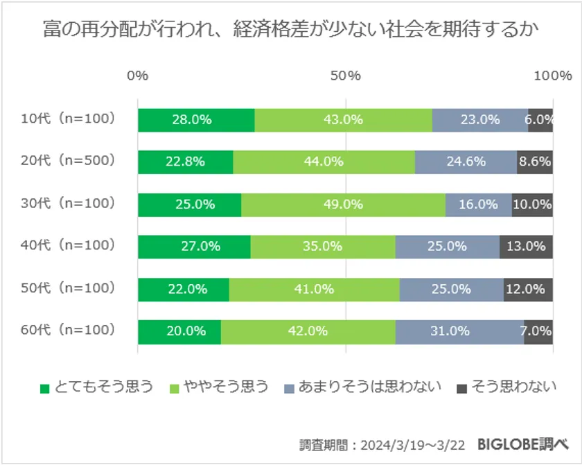 また、「富の再分配が行われ、経済格差が少ない社会を期待するか」を質問したところ、20代では「とてもそう思う」と回答した人は22.8%、「ややそう思う」と回答した人は44.0%に。20代の7割弱が富の再分配が行われ、経済格差が少ない社会を期待していることがわかった。なお、富の再分配が行われ、経済格差が少ない社会を最も期待しているのは30代で、74.0%が望んでいることがわかった。