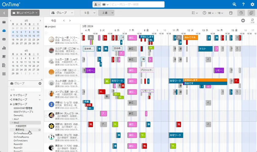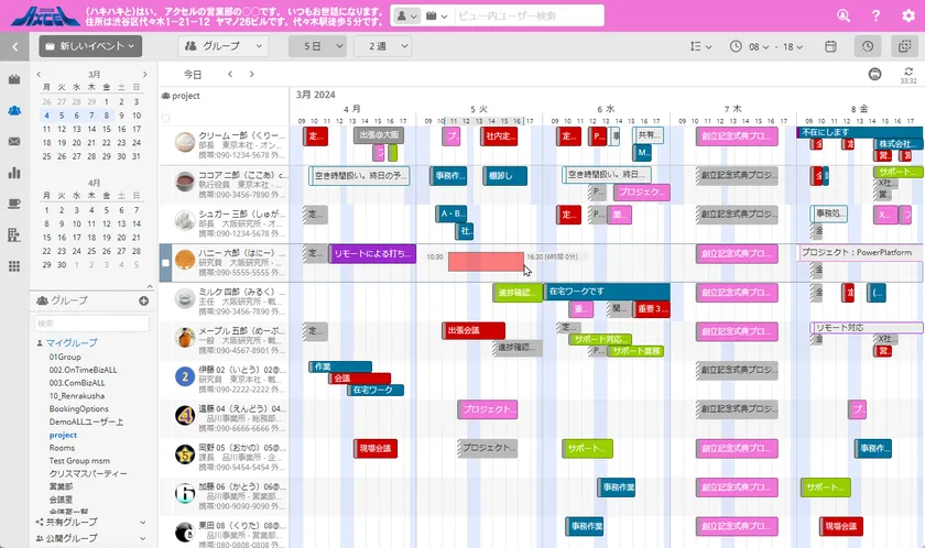 日本の組織が要望する組織メンバーの予定表(スケジュール)を洗練されたデザインで一覧表示。予定管理だけでなくメール、チャット、会議など様々なアクションのベースとなり、永く磨き上げられてきた機能は限りなく理想と考える組織スケジュール、グループカレンダー、行先掲示板となり日本の組織のDXを支えます。
