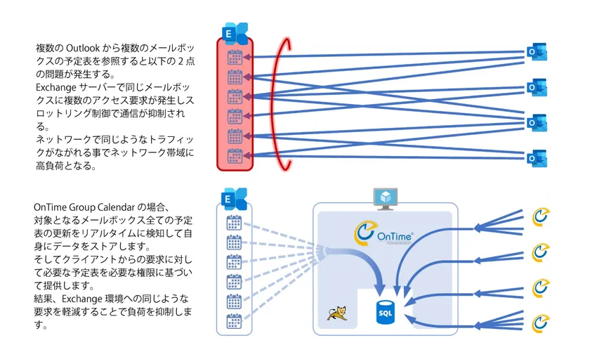 複数のMicrosoft 365テナント、HCL Dominoシステムに対してOnTimeはキャッシュサーバーのように振る舞い、クラウド側とネットワーク帯域の高負荷を軽減します。メールカレンダー基盤の指定された期間の全ての予定データをOnTimeがリアルタイム同期を行い、例え1万を超えるメールボックスであってもストレスなくクライアントにスケジュールデータを提供します。